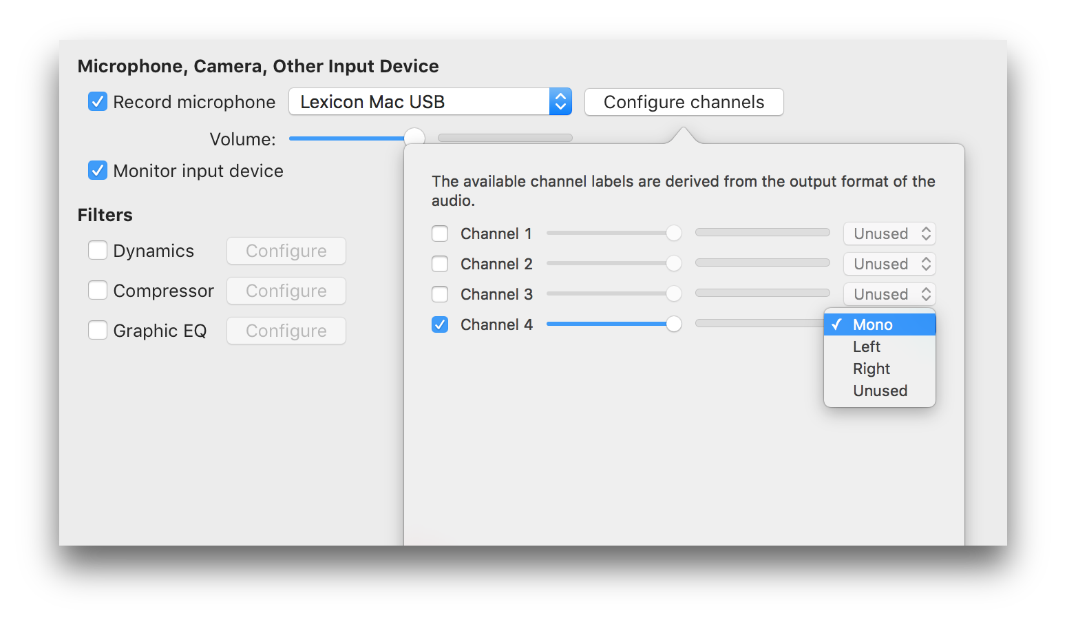 | Audio filters (dynamics, compressor, EQ) | |||
