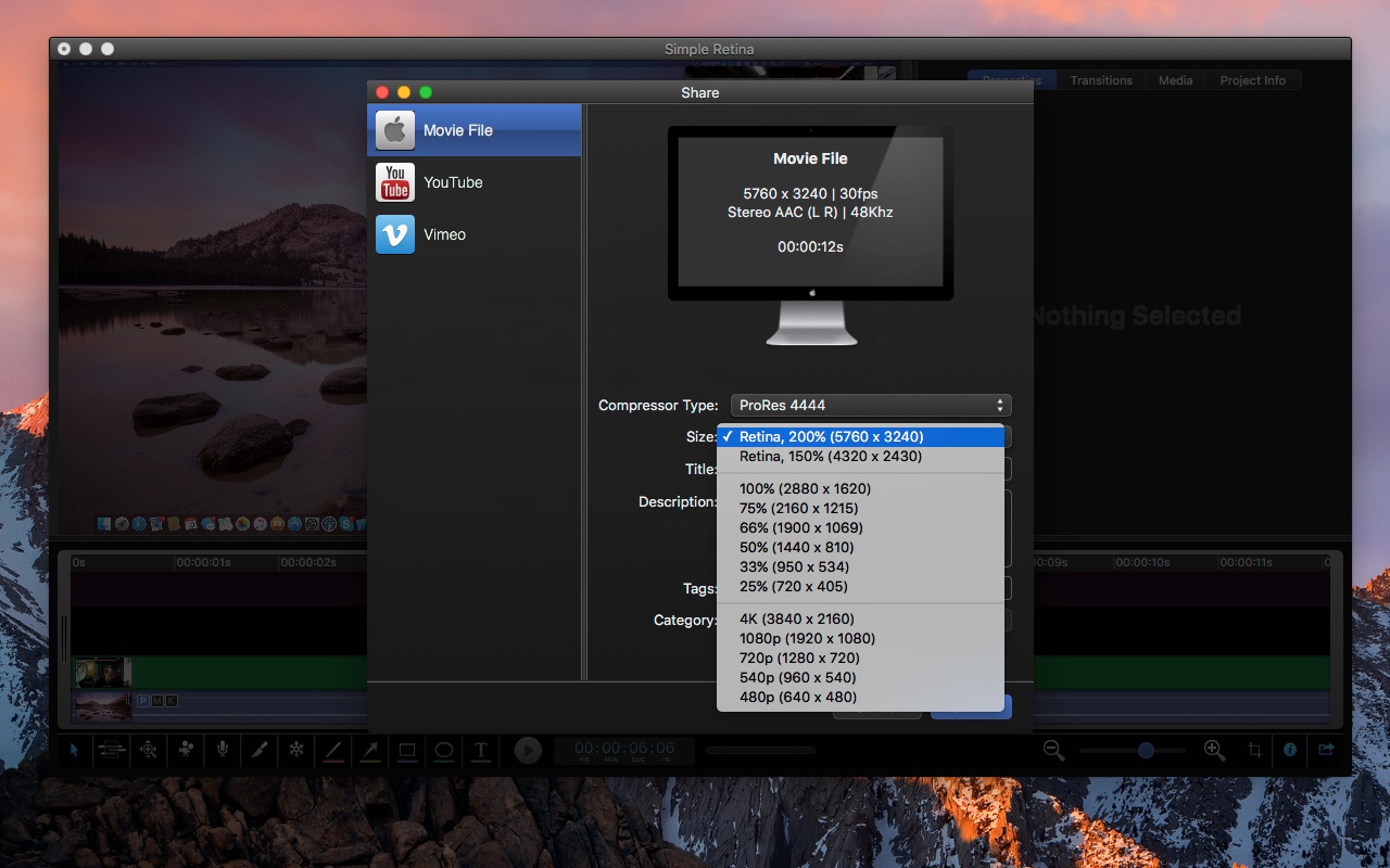 Get your result “out there”! The share/export panel focuses on what your end users need. Quicktime? No problem. Web? No problem! iDevices1? Yep! 1080p? Sure! YouTube, Vimeo as well? You got it!