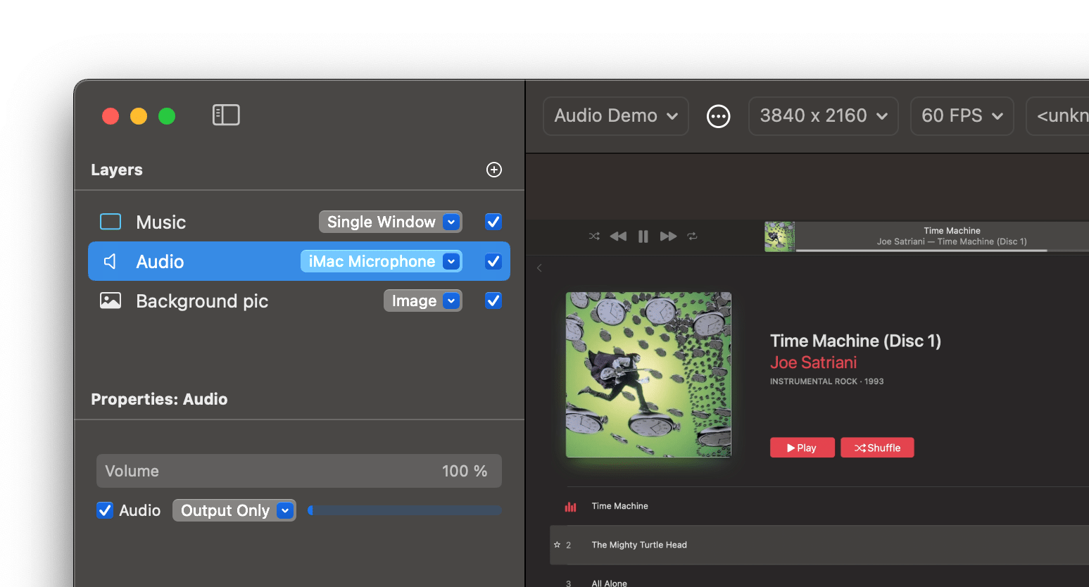 Easily pick what you want to record: apps, microphone or your iPhone - or just everything - without additional drivers or software, it's all built-in. Capture audio from any macOS app, be it a media player1, Safari, GarageBand, and so on. You can also add your voice to the recording, using any microphone you have. Mono. Stereo. Whatever. It's all good. [1] not saying you should capture this awesome album shown in the picture. Because you shouldn't. That would be being a bad person. But you could. Just saying.Go simple, or go nuts