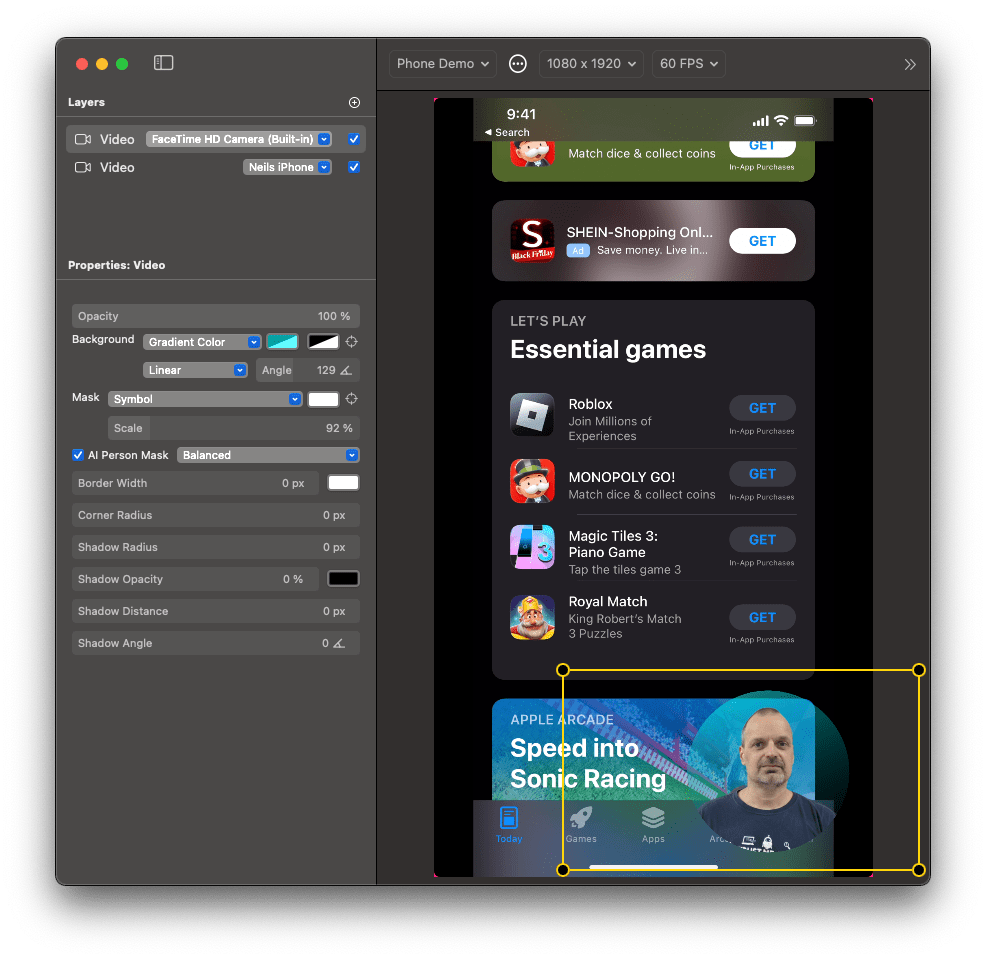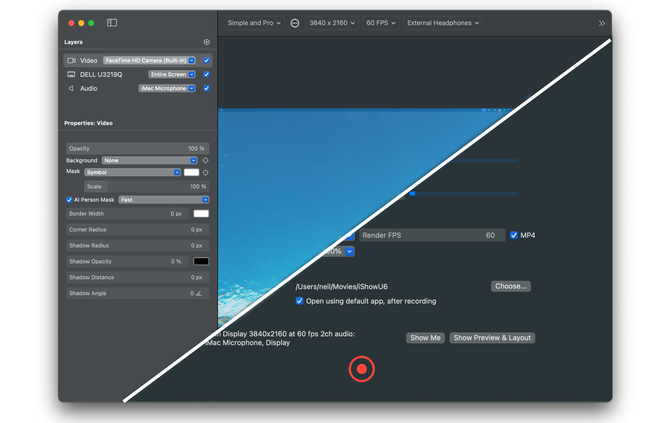 Beautiful backgrounds & AI driven masks, all built-in. Beautify your background with gradients, a variety of masks, including AI driven background removal. iShowU includes a number of common mask shapes (e.g: circle, oval, square), and also lets you use your own custom backgrounds and / or masks as well. No need for a green screen or any other software. iShowU gives you the freedom to express yourself and unleash your creativity. Don't miss this opportunity to try the app for free and discover the amazing possibilities of built-in masks!